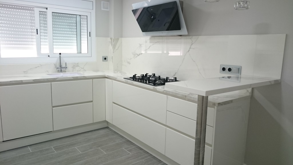 Este es el resultado de la cocina reformada por Escudero Disseny con materiales similares al mármol Calacatta, concretamente con Neolith Calacatta. Fíjate que elegancia