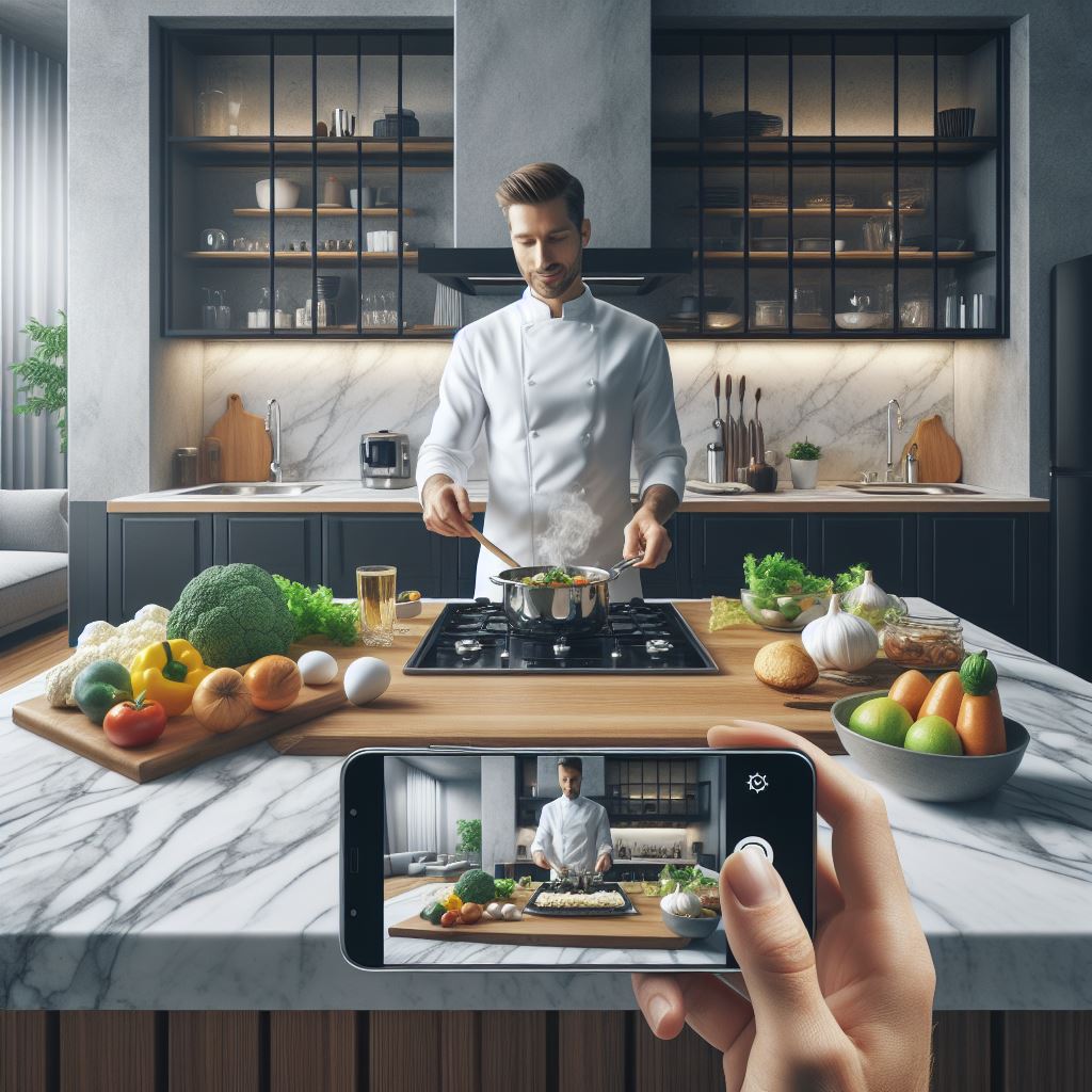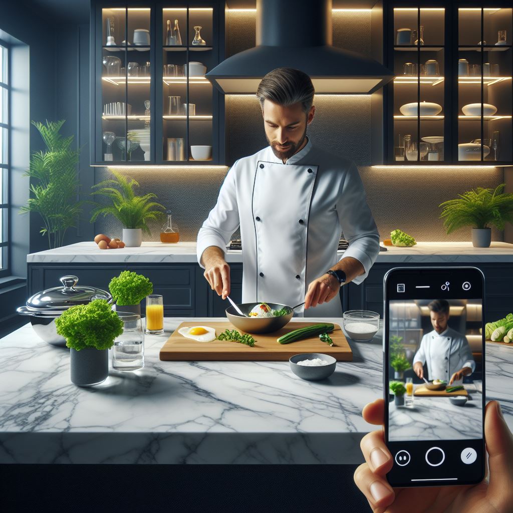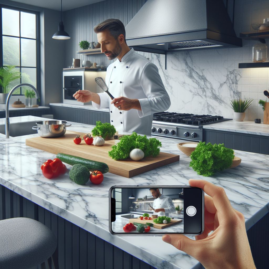Volvamos a nuestro particular mundo donde soñar es gratis y donde todo es posible gracias a la IA. Esta vez nos imaginaremos que somos un/a chef muy reconocido/a en las redes sociales #foodie y que hace sus maravillosas creaciones desde su preciosa cocina. Concretamente desde una enorme isla con una encimera de Calacatta que nos permite hacer nuestras recetas y vídeos de forma cómoda y muy visual. Que maravilla!!!