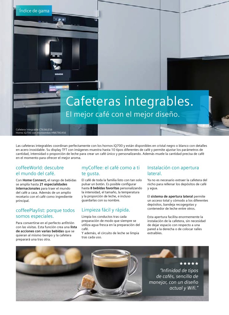 Las cafeteras integrables te traen lo mejor de una cafetería profesional a casa, para que puedas disfrutar de una bebida deliciosa cuando tú quieras. Su tamaño compacto hace que encajen perfectamente en tu cocina. Instala tu cafetera en un mueble a una altura adecuada para poder manejarlo con comodidad estando de pie. Con sus materiales de calidad y su atractivo diseño, crea una impresión visual ideal y queda perfectamente junto a otros electrodomésticos integrables Siemens.