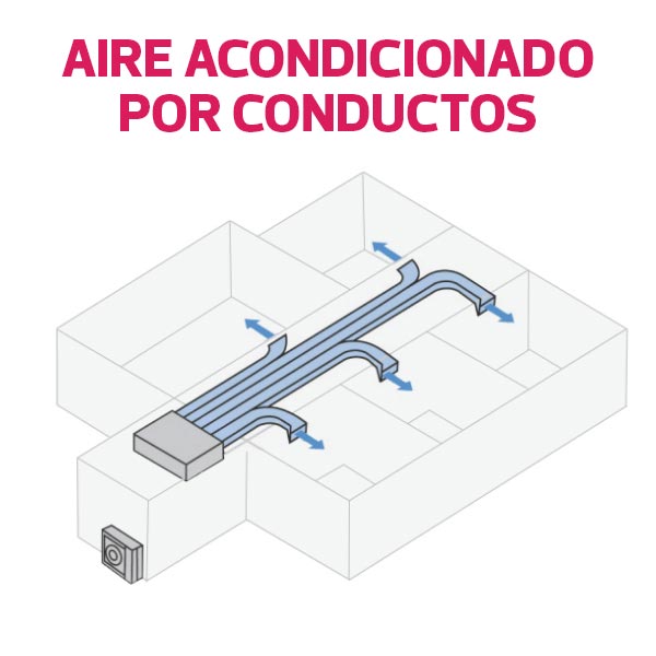 En este caso también tendremos una unidad exterior, pero con una serie de conductos que distribuyen el aire por toda la casa. Estos conductos suelen ir por el falso techo y se abren a las habitaciones a través de rejillas. El precio medio de estos aparatos para un vivienda de unos 80 metros cuadrados es de 2.000 euros, a lo que habría que unir la instalación si no está ya hecha.