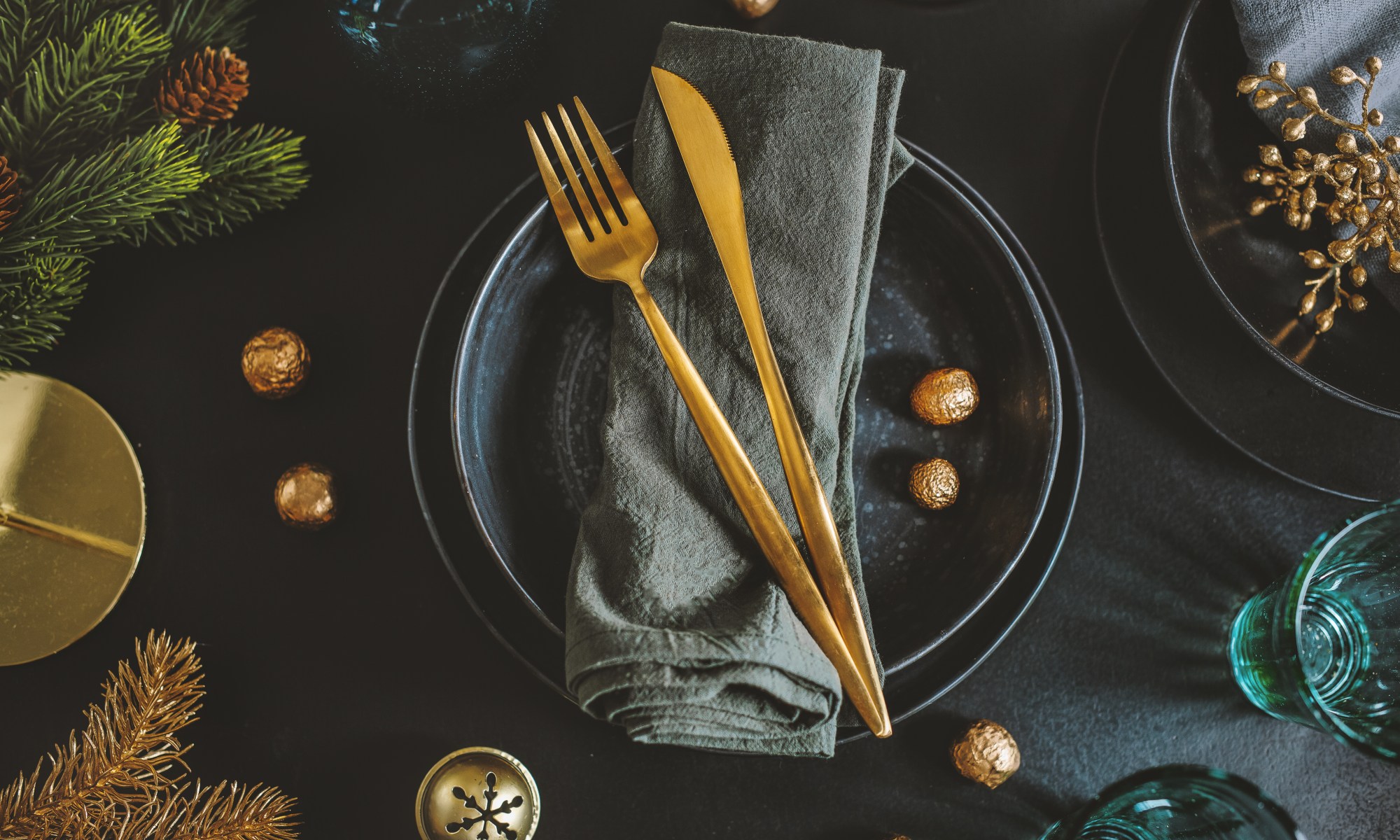 Poner correctamente los platos y las copas en la mesa en Navidad