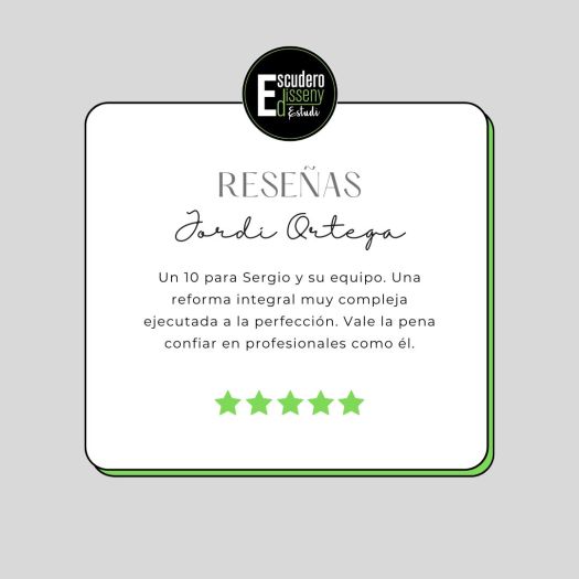 ESCUDERO DISSENY lleva más de 20 años reformando hogares y locales. Dicen que la experiencia es un grado y en todo este tiempo Escudero Disseny se ha encontrado con multitud de problemas en las obras que ha podido solucionar, en muchos casos, asumiendo unos costes adicionales al presupuesto inicial. En otros casos dedicando un tiempo extra al calculado inicialmente, pero siempre entregando las obras en las mejores condiciones y con los acabados que el cliente se merece. Escudero Disseny sólo trabaja con materiales y proveedores que ofrecen una calidad media/alta, de ese modo puede ofrecer una garantía que con materiales de gama baja no podría. Por otro lado nuestras marcas tienen un buen servicio técnico en caso de avería, como es el caso de los electrodomésticos de alta gama, que además tienen una garantía mucho más larga. Es por estos detalles por lo que la empresa Escudero Disseny, S.L.U. y su equipo se han ganado el prestigio y la confianza de sus clientes.