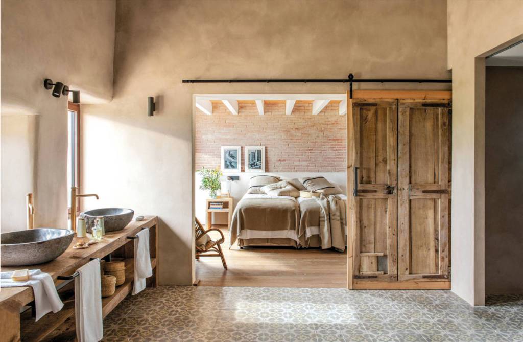 La restauradora Ariadna Asturias, de la constructora Somnisamida, eligió una puerta de madera recuperada para conectar el dormitorio con el baño. Optó por un diseño tipo granero, corredera, de cuarterones y con los herrajes a la vista. Esa misma madera la ha utilizado también en el mueble del lavabo.