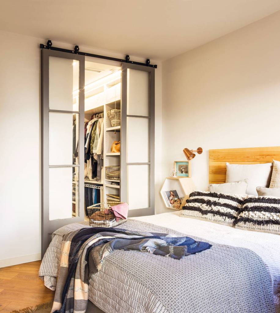 Pintada en gris y con cuarterones acristalados, esta puerta es tan práctica como decorativa por sí sola. Se ha utilizado para comunicar el dormitorio con el vestidor y darle así profundidad a la estancia.