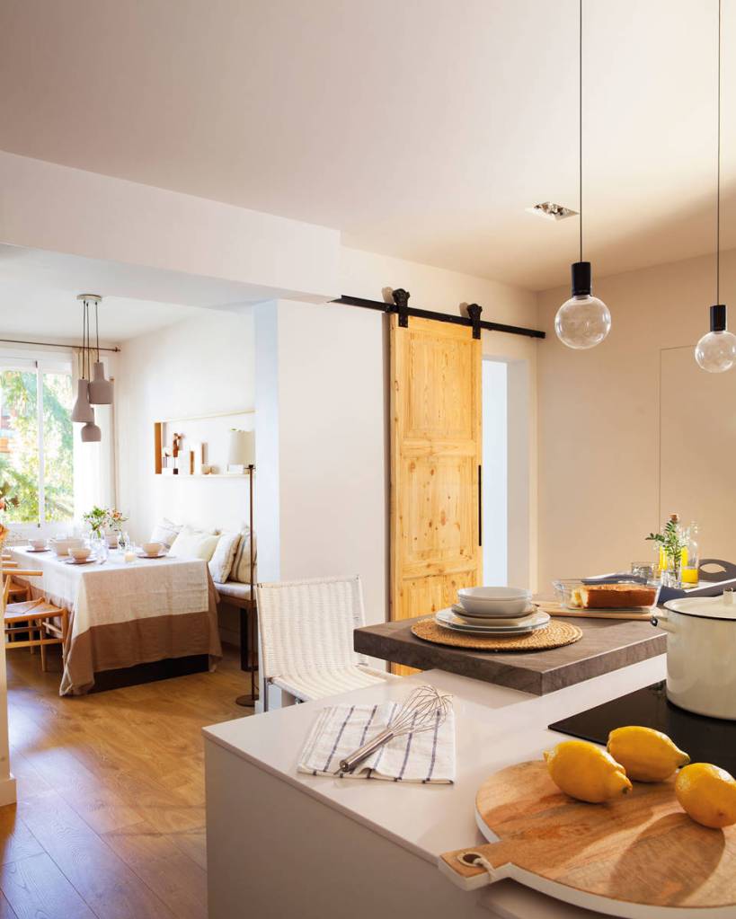Conectar o separar ambientes al gusto de sus propietarios, esa es la mejor ventaja de las puertas correderas. Esta cocina se comunica (o no) con el salón con una puerta de granero de madera recuperada, lacada en gris, a juego con los herrajes negros.