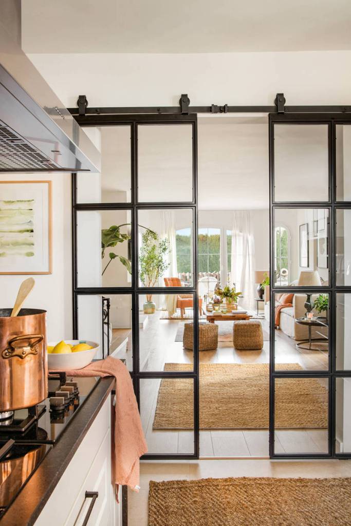 Aquí tienes una puerta de granero pero en versión industrial, es decir, la madera se ha sustituido por el metal y la opacidad por cristaleras. De su diseño original solo conserva los herrajes a la vista. Es un proyecto de Rocío Vega, de The New Home Concept, para comunicar la cocina con el salón y disfrutar de las vistas del jardín al fondo.