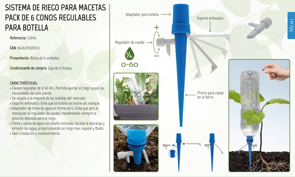 Se trata de una solución pensada para poner en la boquilla de una botella llena de agua puesta boca abajo. De esta forma, se asegura que las plantas no se quedan sin agua durante el tiempo que se esté ausente. Los dispositivos se adaptan al tamaño de la mayoría de botellas y se activan automáticamente cuando notan que la tierra está seca. Son muy fáciles de instalar y sirven tanto para plantas de interior como de exterior. Eso si, debes tener espacio en la maceta para que quepa la botella de agua.
