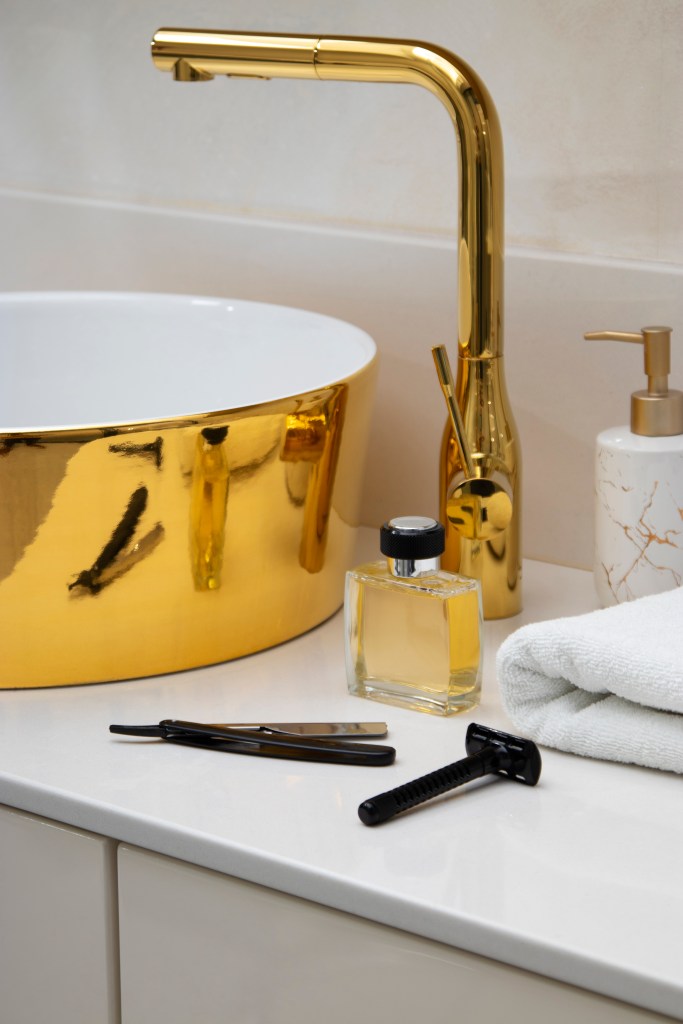 Un toque dorado, tanto en el marco del espejo como en la grifería, dará mucha sofisticación a nuestro baño.
