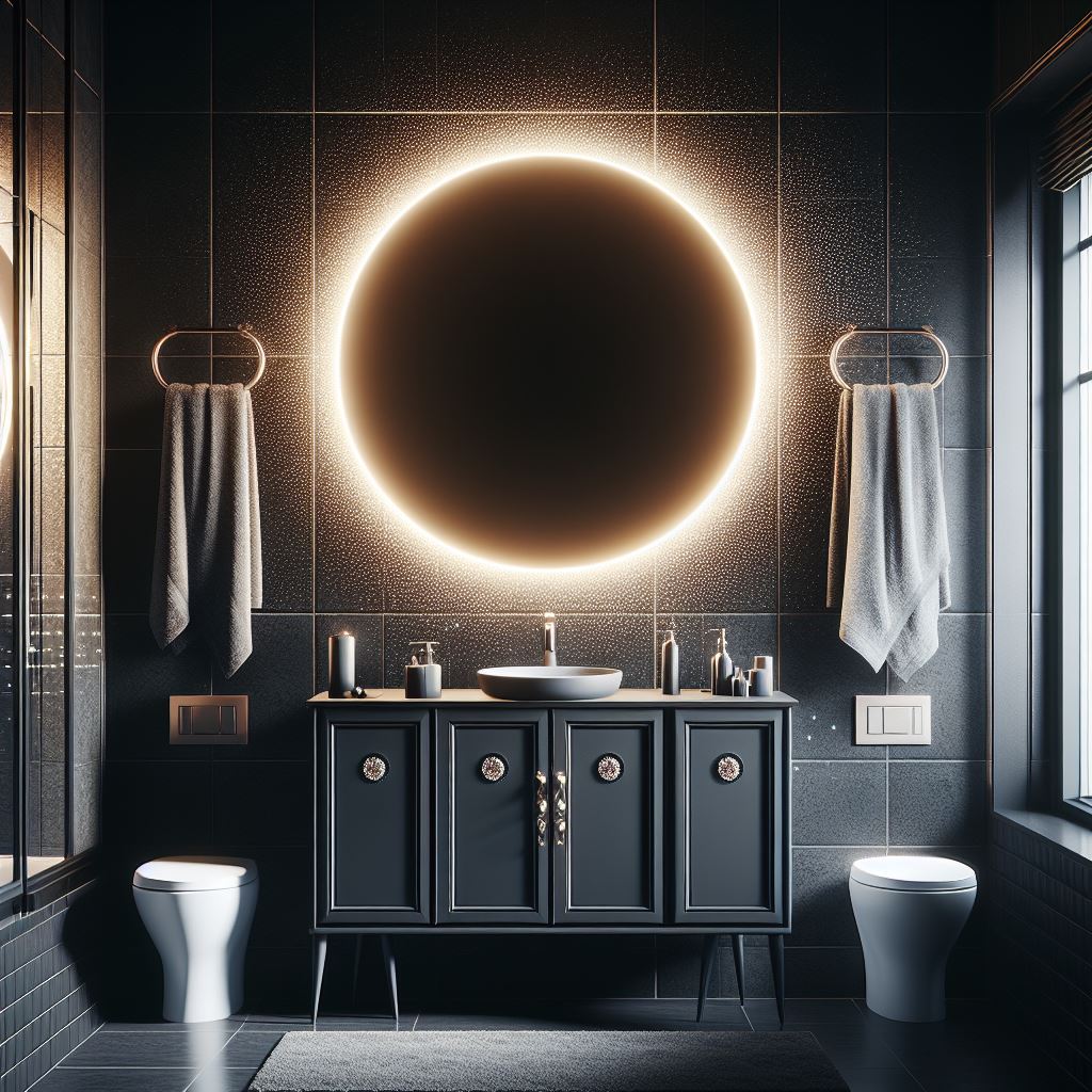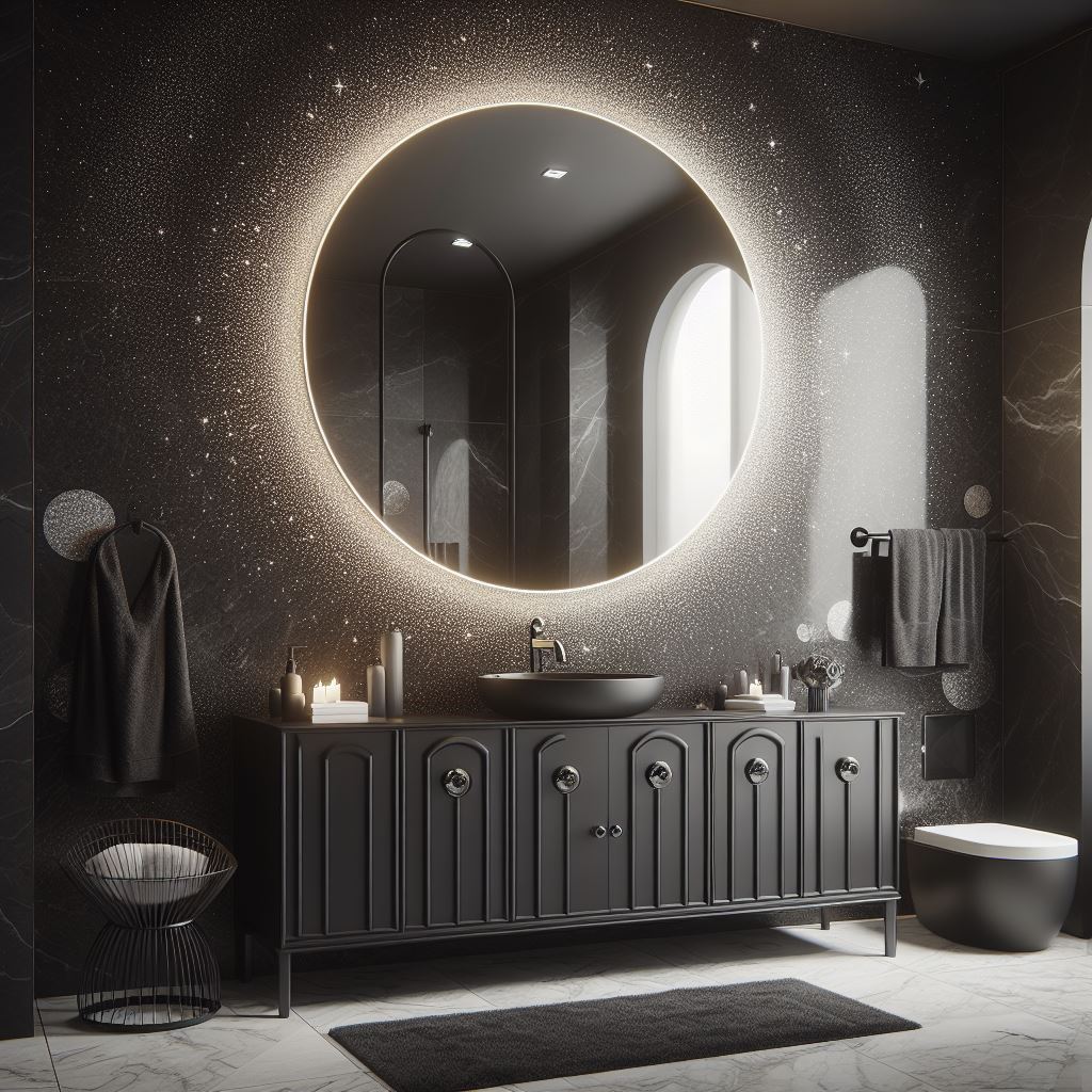 Así de sencillo y así de elegante. Un baño donde predomina el negro destacando un espejo redondo con luz indirecta que crea el efecto eclipse.