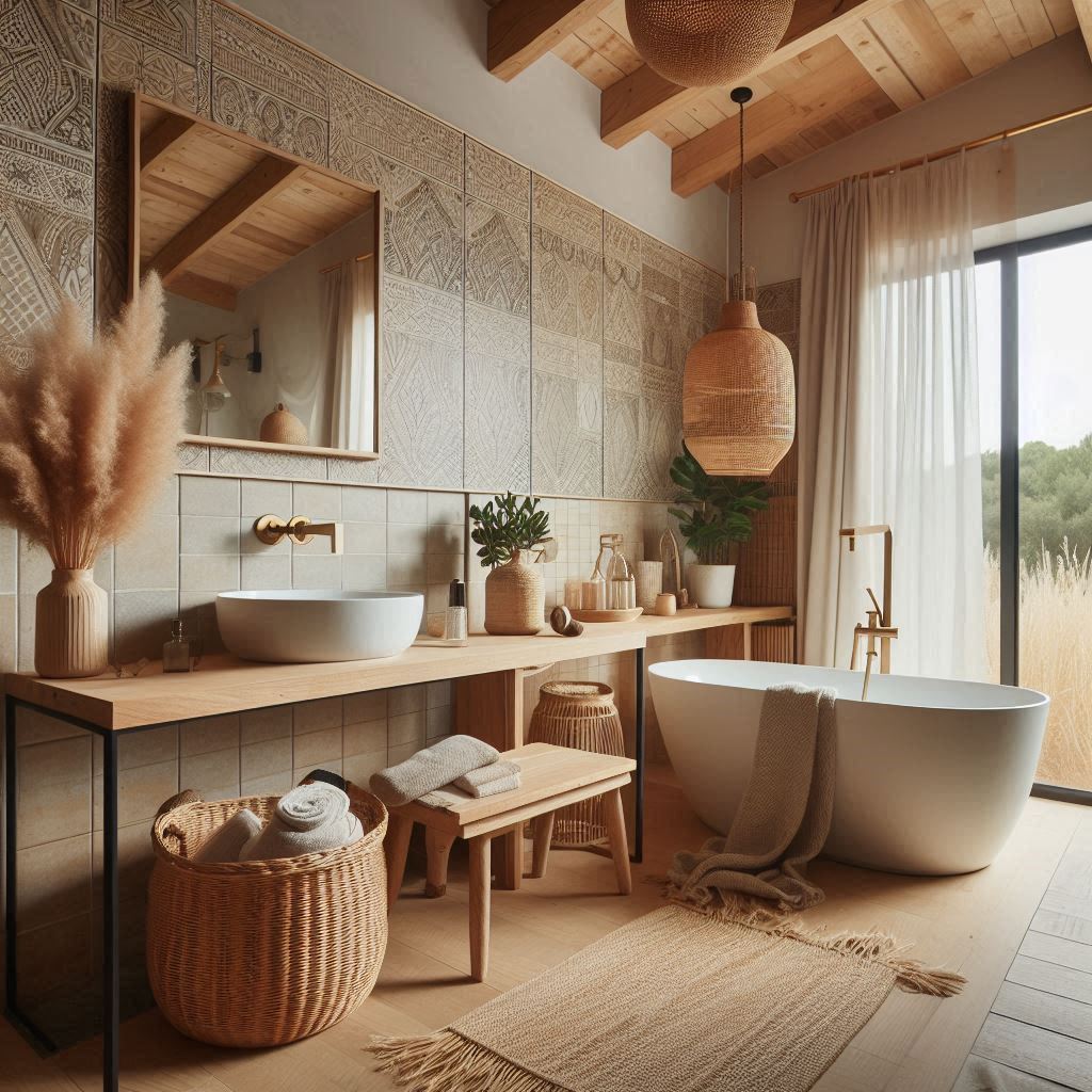 El estilo Boho gana adeptos cada día, también en los baños. En tonos blancos, beiges y materiales naturales , el estilo Boho nos encanta. Este espacio tan íntimo donde reina la paz, armonía y el bienestar quedará genial con bases muy neutras en tonos claros y materiales como la madera y el mimbre. Te mostramos algunas ideas para tu inspiración creadas con IA.