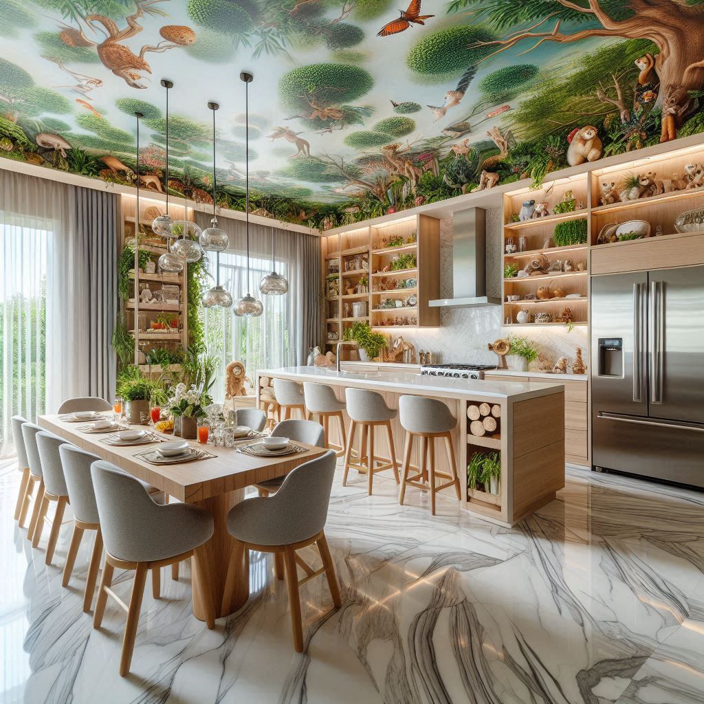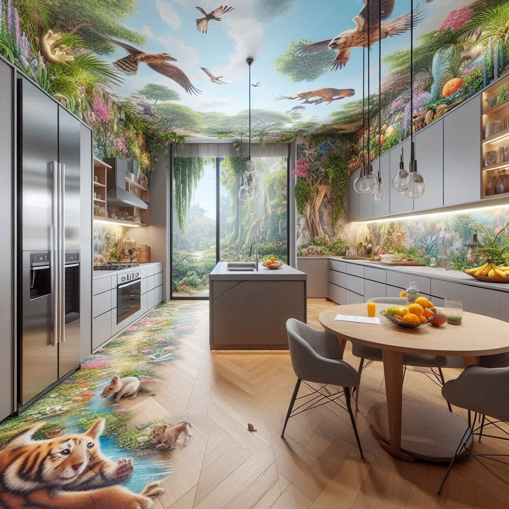 Imagínate tener una cocina llena de luz y con las últimas novedades del mercado toda ella como si estuviera integrada en un bosque, en plena naturaleza. Con tu pequeño huerto para poder cocinar con productos de cosecha propia y 100% ecológicos. Que maravilla, verdad!. Soñar es gratis, y la IA nos trae estas imágenes llenas de fantasía, pero no descartes esas locas ideas, pues podemos hacer realidad tus fantasías.