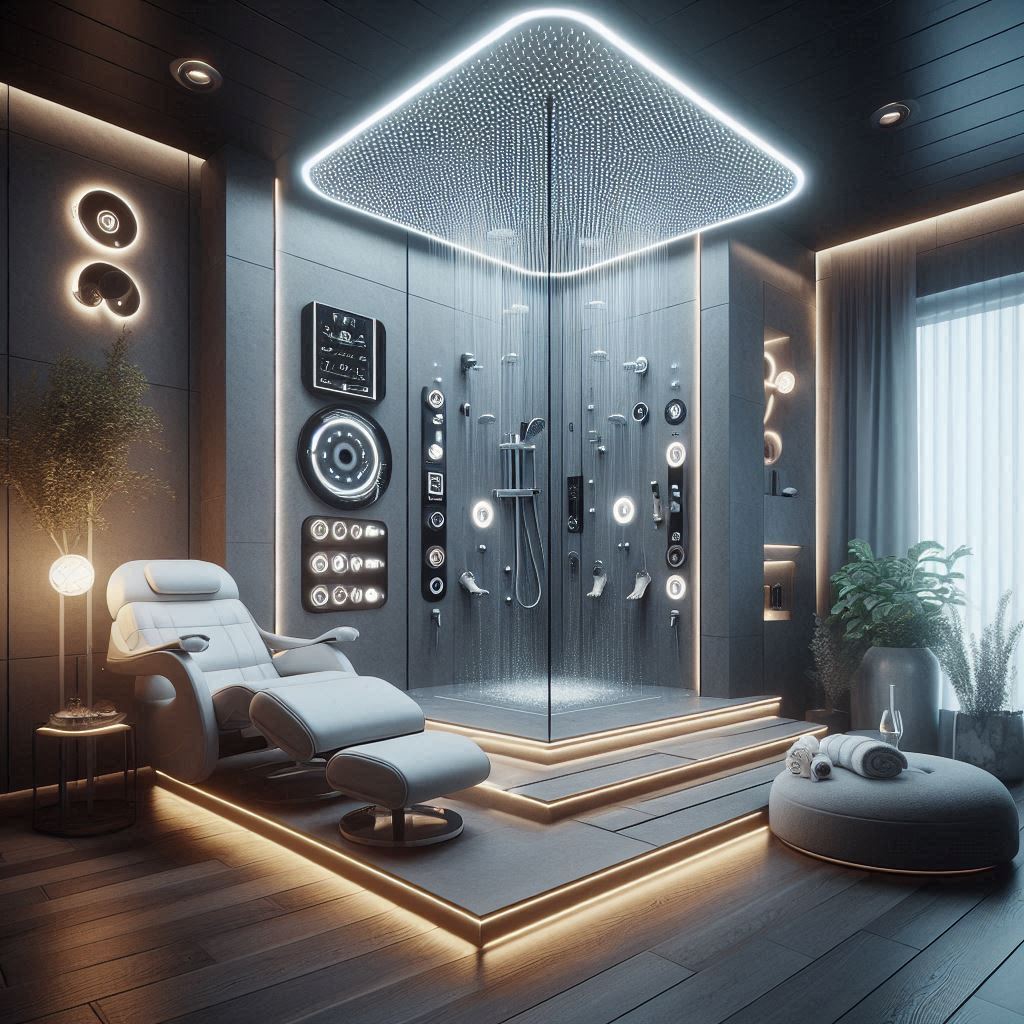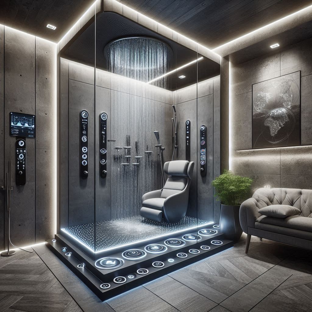 Nos hemos vuelto a ir a la Inteligencia artificial y a nuestra imaginación para crear esa ducha futurista y llena de comodidad y tecnología. Una ducha con sillón de masajes incorporado, con música, luces y chorros de agua personalizados para desconectar de toda la semana. ¿Qué te parace?, ¿Se nos ha ido mucho la olla?. 😆😜