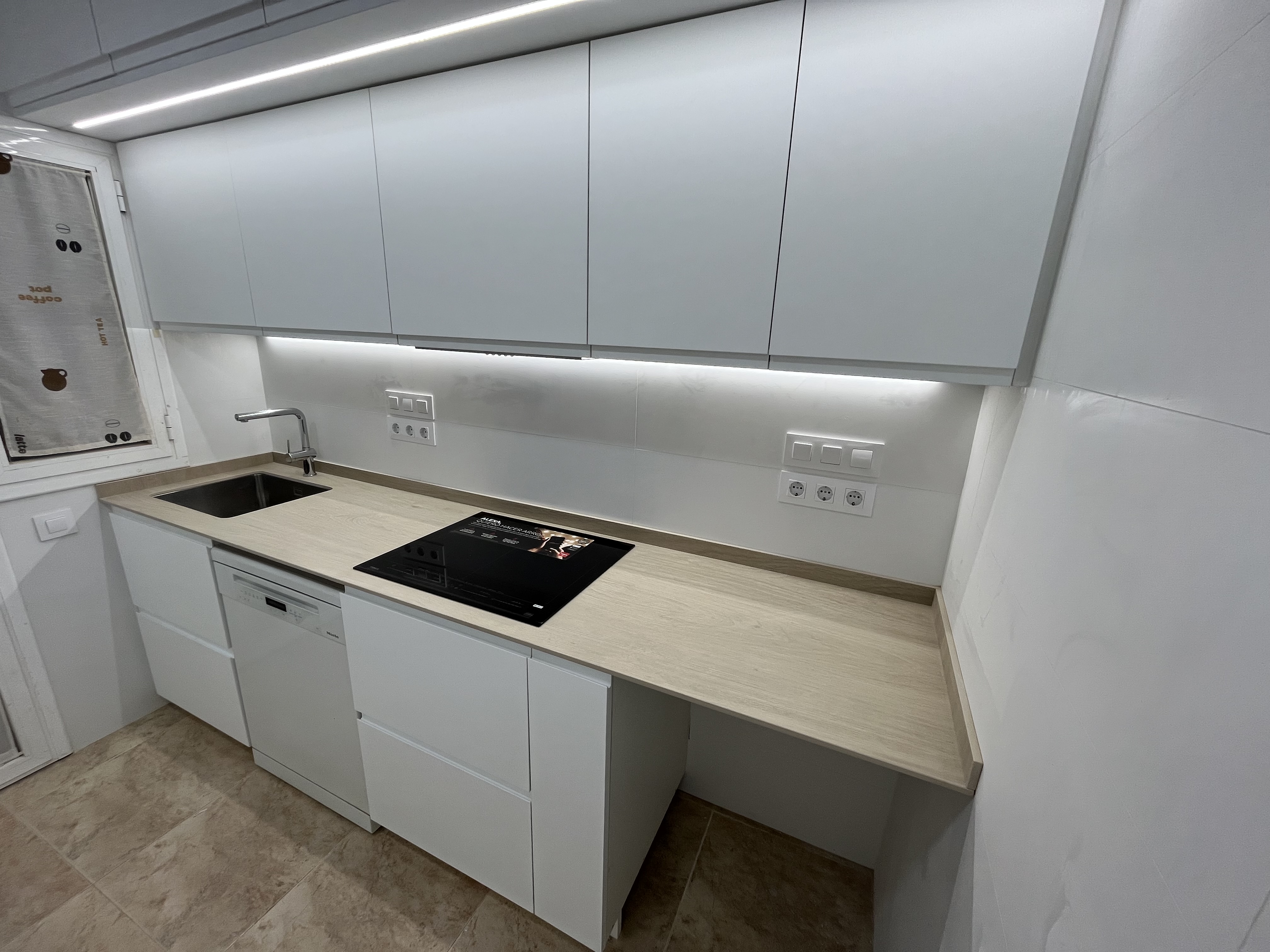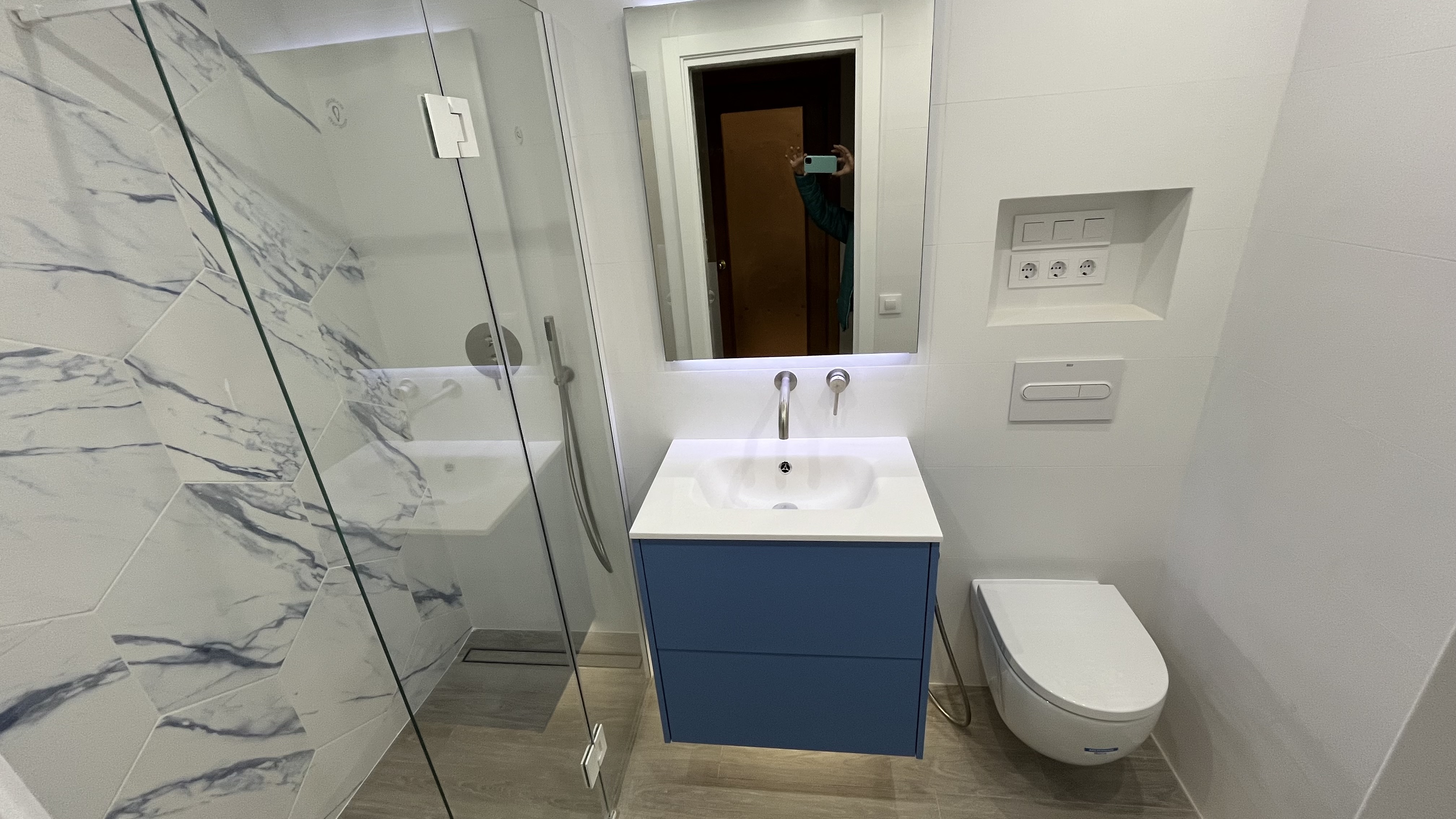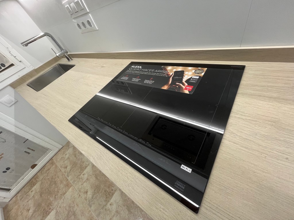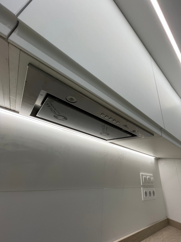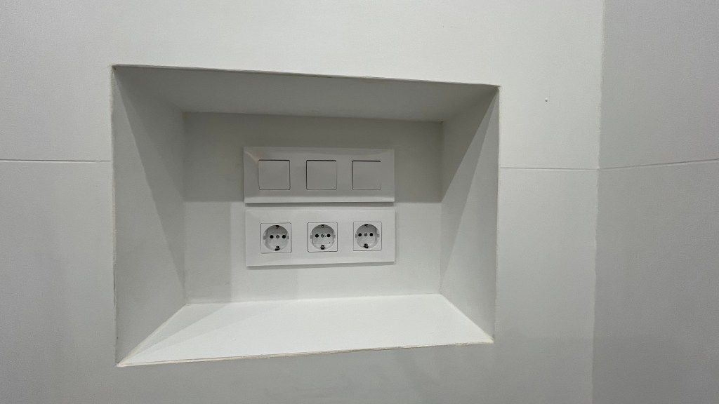 Tanto en la cocina como en el baño, el cliente quería poner puerta corredera de cristal. Para las instalaciones de luz, pidió expresamente enchufes con corte de luz, algo muy habitual en Alemania de donde es originario.